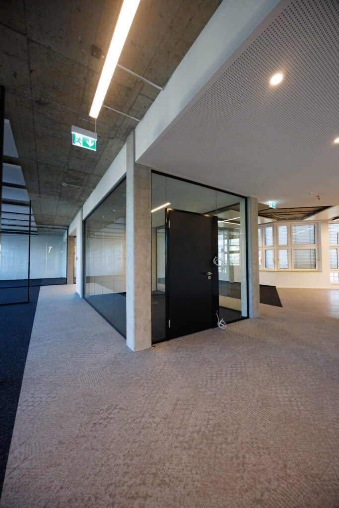 Es wird bewusst auf klassische Türen verzichtet. Stattdessen trennen Glaswände die einzelnen Bereiche voneinander, wodurch Struktur entsteht, die Offenheit gefördert wird und der Austausch zunimmt. Die neue Bürofläche unterstützt dadurch unsere Arbeitsweise und bietet Raum für Zusammenarbeit, Entwicklung und Wachstum.